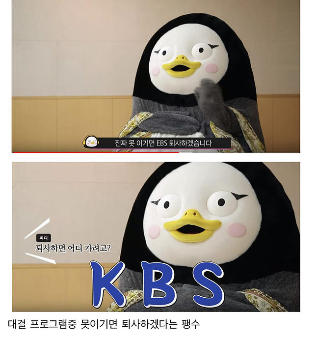 스몰포워드 주의(스포주의) 결국 져서 KBS 이적 준비해야하죠. 아 가만... EBS 전신이 KBS 3TV인데... 아 펭수가 이 점을 노리고 미꾸라지처럼 빠져나오려고?!