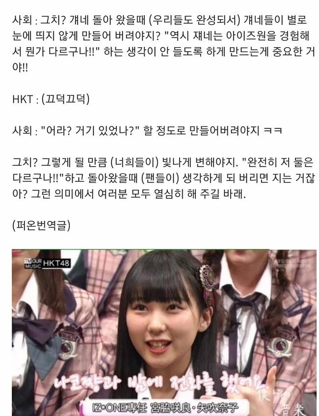 실력의 하향평준화 금방일거라고 봅니다.방송에서 아이즈원 야부키나코 뒷담하는 HKT48 멤버들
