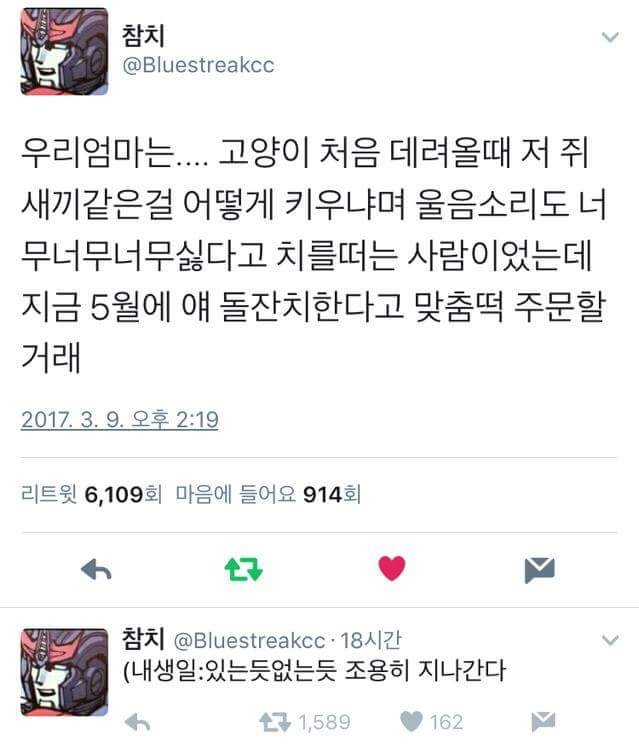저희 어머니는 애완동물 키우는 거 싫어하시길래 동물을 싫어 하시는 줄 알았는데 훗날 언젠가 우리보다 먼저 떠나기 때문에 싫어하시더군요. 물론 지금은 큰 개 두마리 키우고 있지만 언젠가 만날 이별 때문에 안된다고 하시네요.