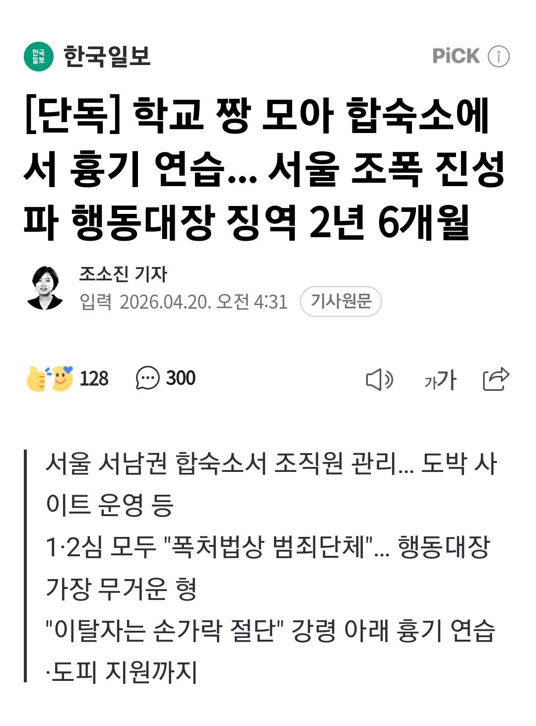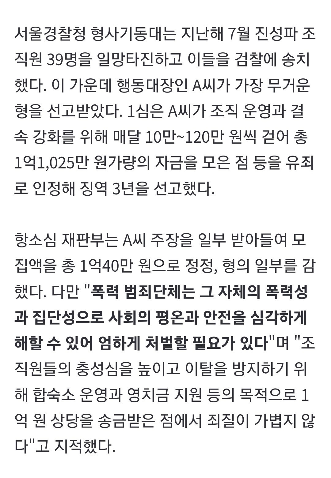 학교 짱 모아 합숙소에서 흉기 연습... 서울 조폭 진성파 행동대장 징역 2년 6개월