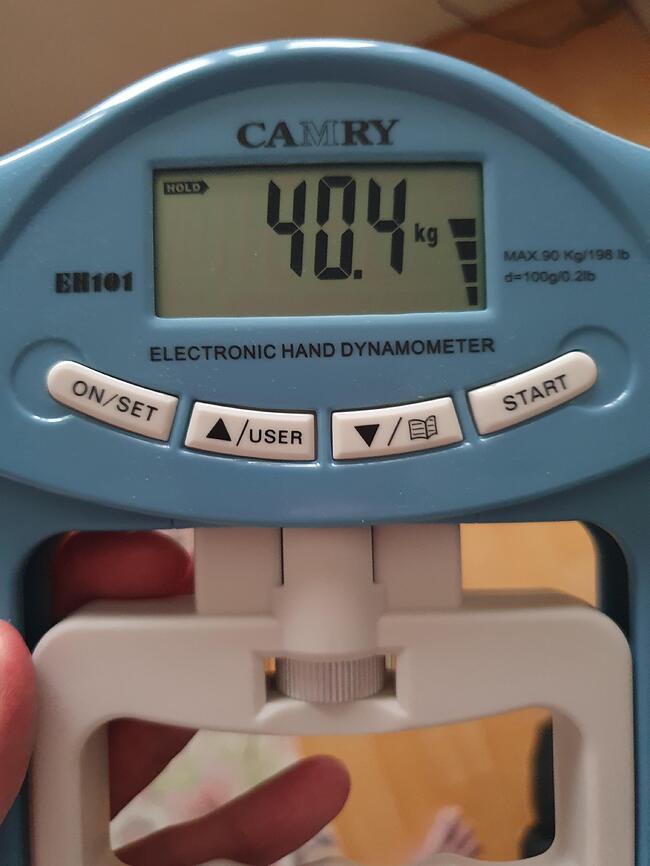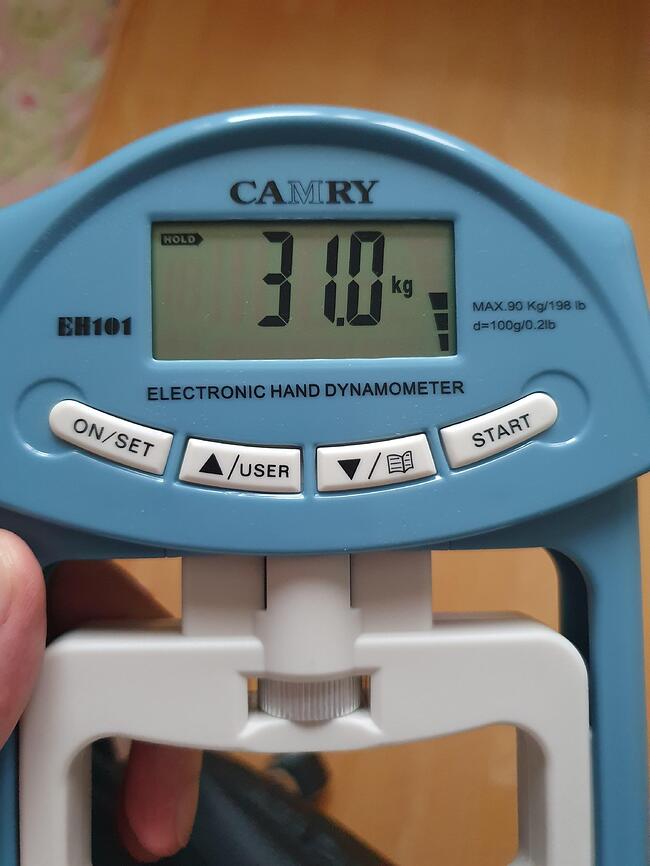 손이랑 손을 잡아서 악력을 하는건 완전 약하고 저 측정기로 최대 오 71 , 왼 70 나왔습니다