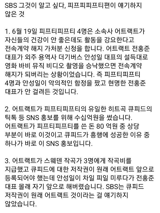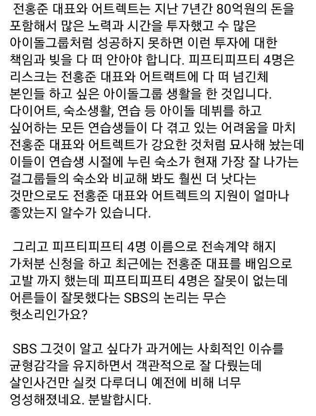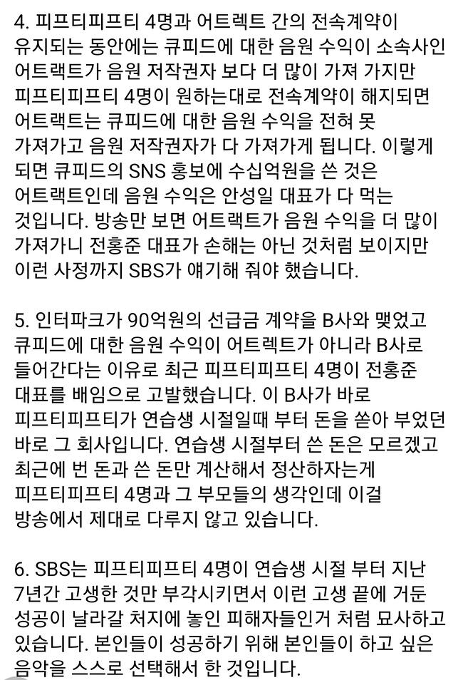 그리고 제가 위처럼 생각하는 이유는 멤버들측에서 지속적으로 정산에 관련해 자료 제공을 주장해 왔고, 그 자료를 제공해서 멤버 대변인 변호사 측에서 받았는데 또 다른걸 얘기하는걸 보니, 이미 결과를 이미 산정해 놓고 어떻해서든 계약해지로 끌고 갈려고 하는게 아닐까 라는 생각입니다. 어떻게 보면 그게 당연한 거지만 이제는 그냥 어거지를 쓰는것처럼 보일정도로 심하다고 생각합니다.
