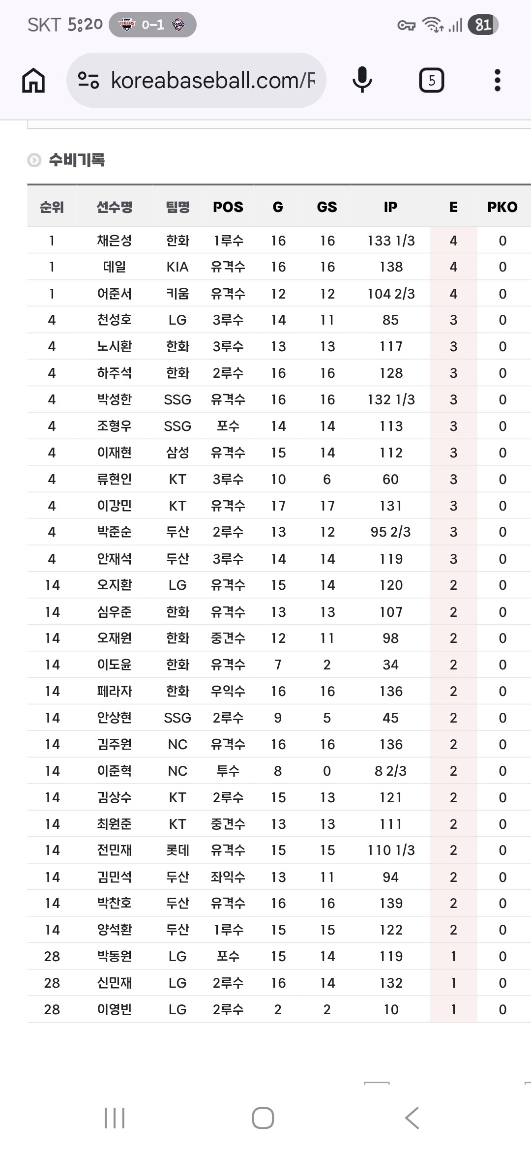 리그 실책 단독 1위 됐네요