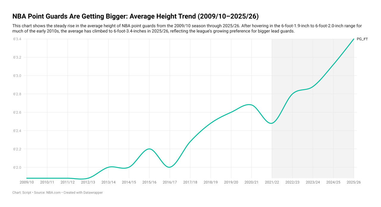 최근 NBA에서 포인트가드 포지션이 어떻게 변하고 있는지를 가장 직관적으로 보여주는 방법 중 하나는, 리그 전체 평균 체격의 흐름을 살펴보는 것입니다.