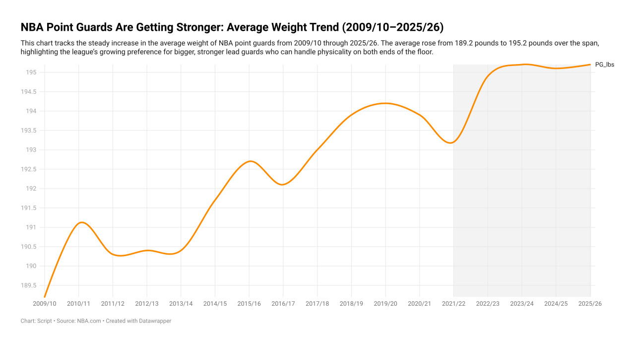 여기서 중요한 건 키만 커진 게 아니라 몸무게도 함께 늘었다는 점입니다. 2009/10시즌 평균 189.2파운드였던 포인트가드 체중은 중간에 약간의 등락은 있어도 전체적으로 꾸준히 우상향하고, 최근에는 195파운드 안팎이 새로운 기준선처럼 자리잡고 있습니다.