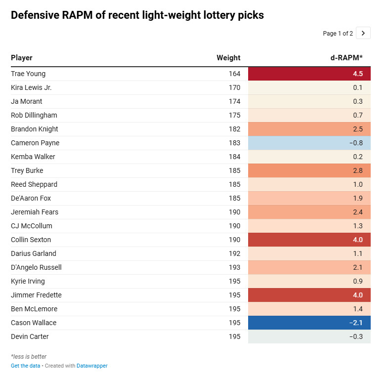 최근 로터리에 지명된 단신 포인트가드들의 d-RAPM을 보면 공격 재능과 별개로 수비 지표에서 약점을 드러낸 사례가 매우 많고, 좋은 수비 수치를 남긴 경우는 오히려 예외에 가깝습니다.