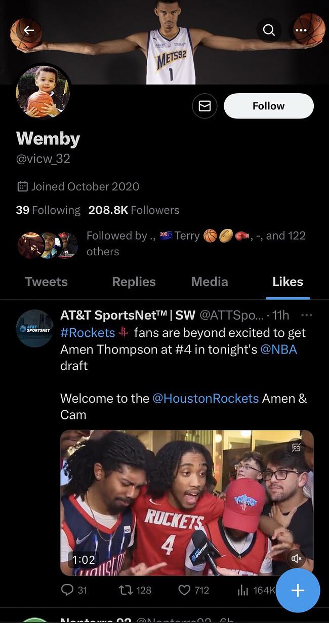 휴스턴팬들이 아멘탐슨을 뽑은것에 기쁘다고 한 트윗에 좋아요를 누른 웸반야마