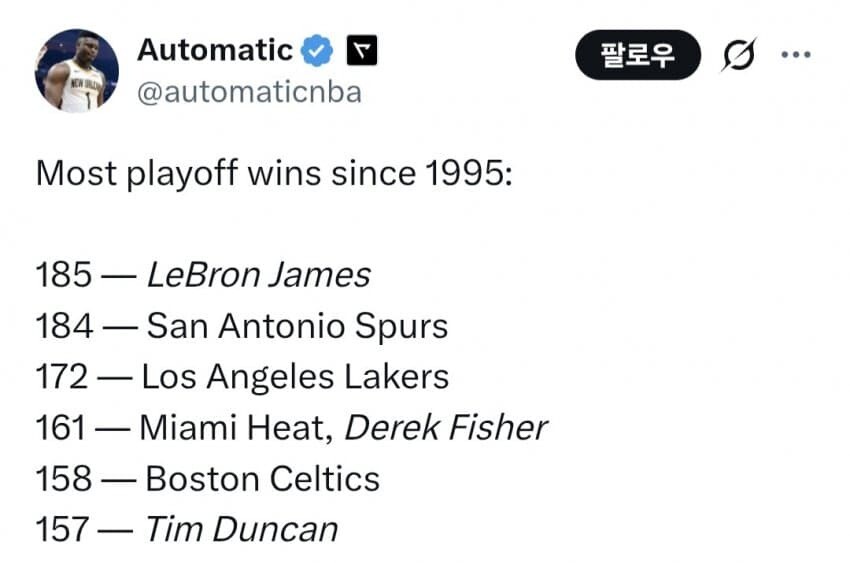 당연해서 95년도이후 샌안토니오184승보다 높은 승수를 가진 슈퍼스타 누가있을까요?